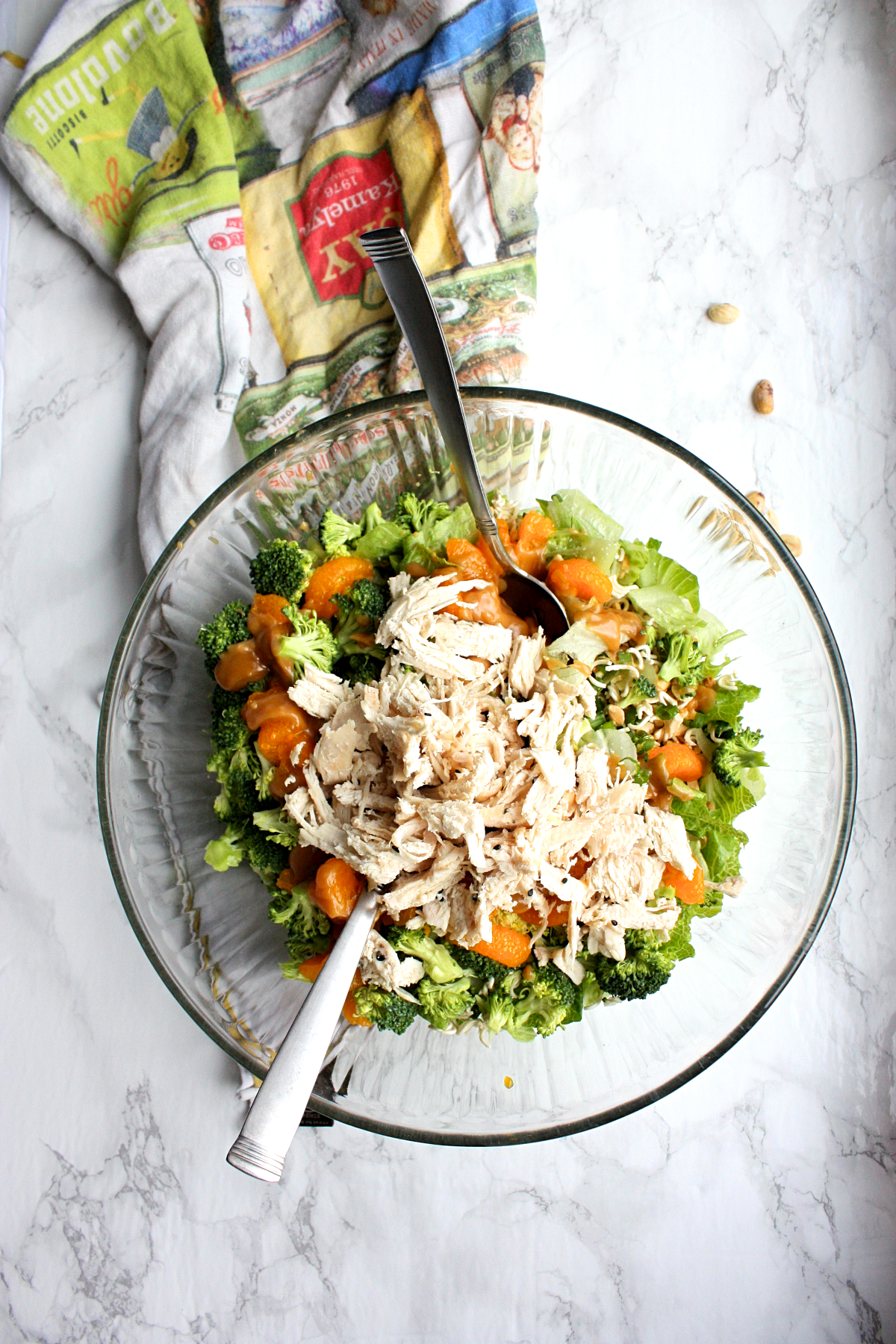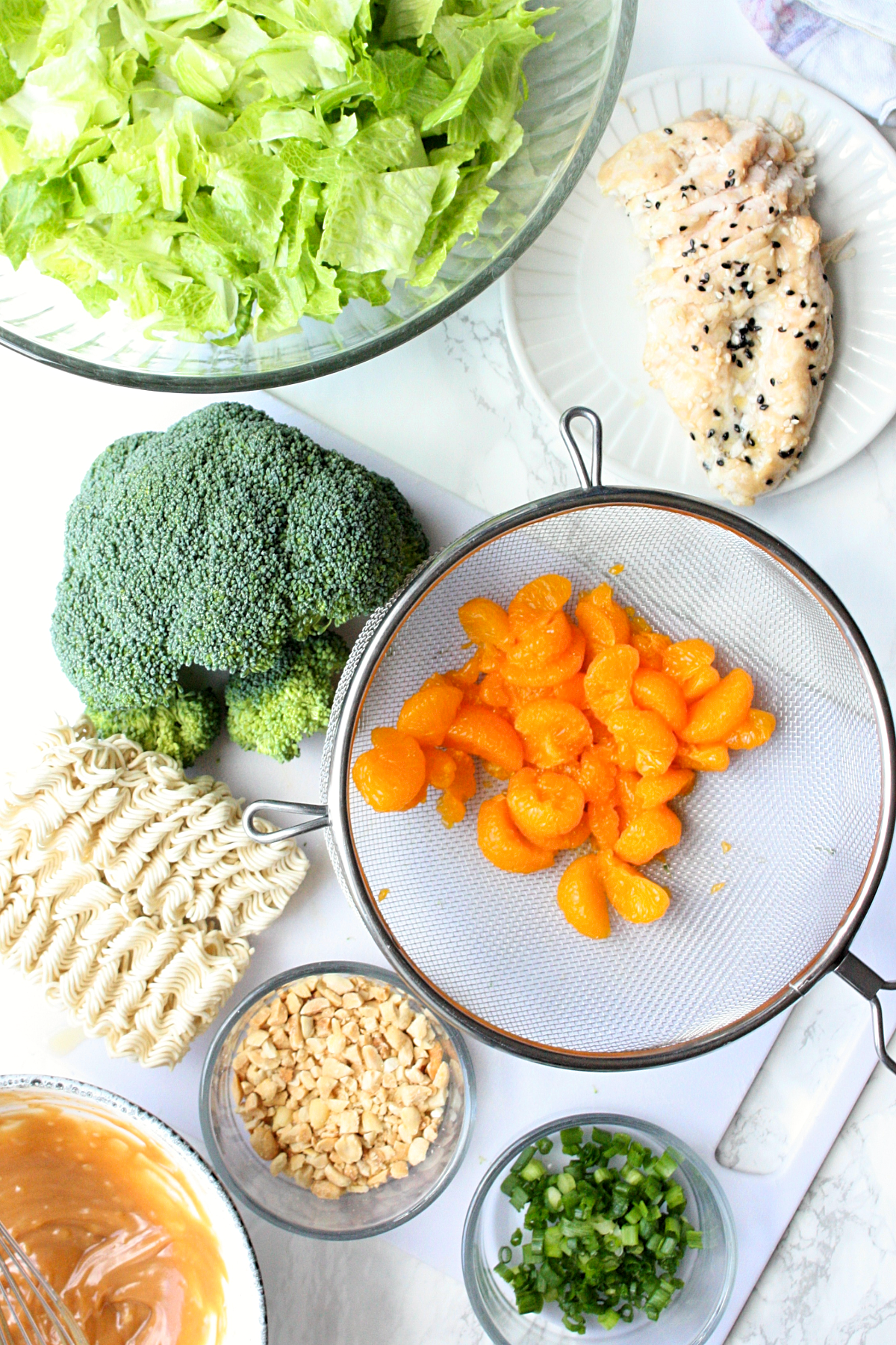 - In a large serving bowl, toss broccoli florets, romaine, green onions, crushed ramen, mandarins, chopped chicken and peanuts.