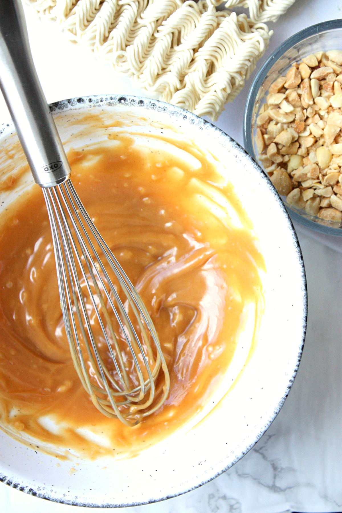 - In a small bowl, melt and stir peanut butter (microwave for 1 minute on high). Whisk in water, sesame oil, soya, vinegar, honey and garlic. Add a splash or more of water until your desired consistency is reached.