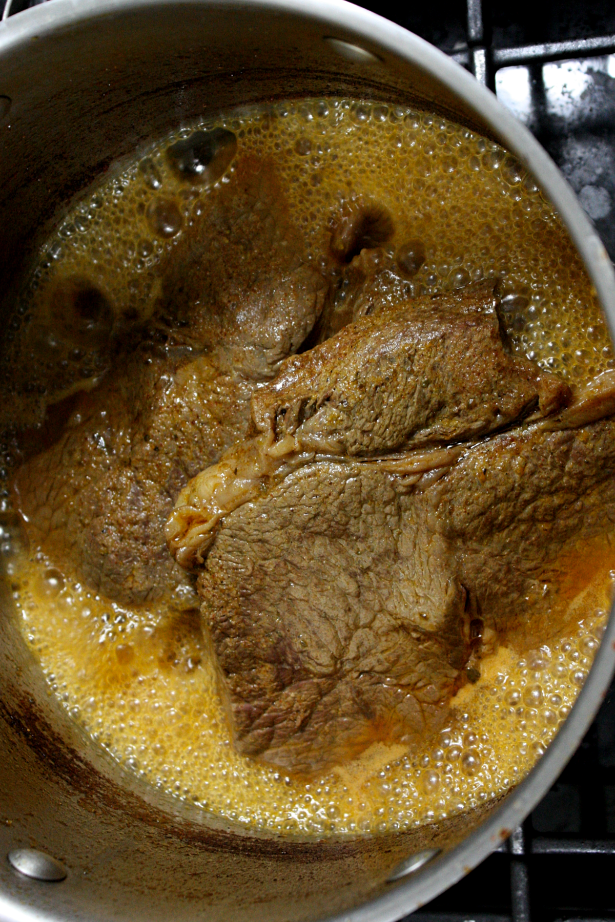 - In a large stovetop pot, add water to the halfway mark and bring to a boil. Add in salt, spices, garlic cloves and the roasts. Cover and let boil for a minimum of 3 and half hours. Aim to cook for a good 4 hours. The meat becomes more tender the longer it is cooked. You'll know the meat is ready when it falls apart easily in the pot with tongs. Drain meat into a large colander and let cool for a few minutes (until easily handled). Using your hands, remove any remaining fat or bone (there won't be much), break apart into small pieces and place in a serving bowl. This will require little effort—the pot roast should easily fall apart. Note: roasts should always be fully immersed in boiling water. Check on the roasts every hour or so and add water as necessary to cover.