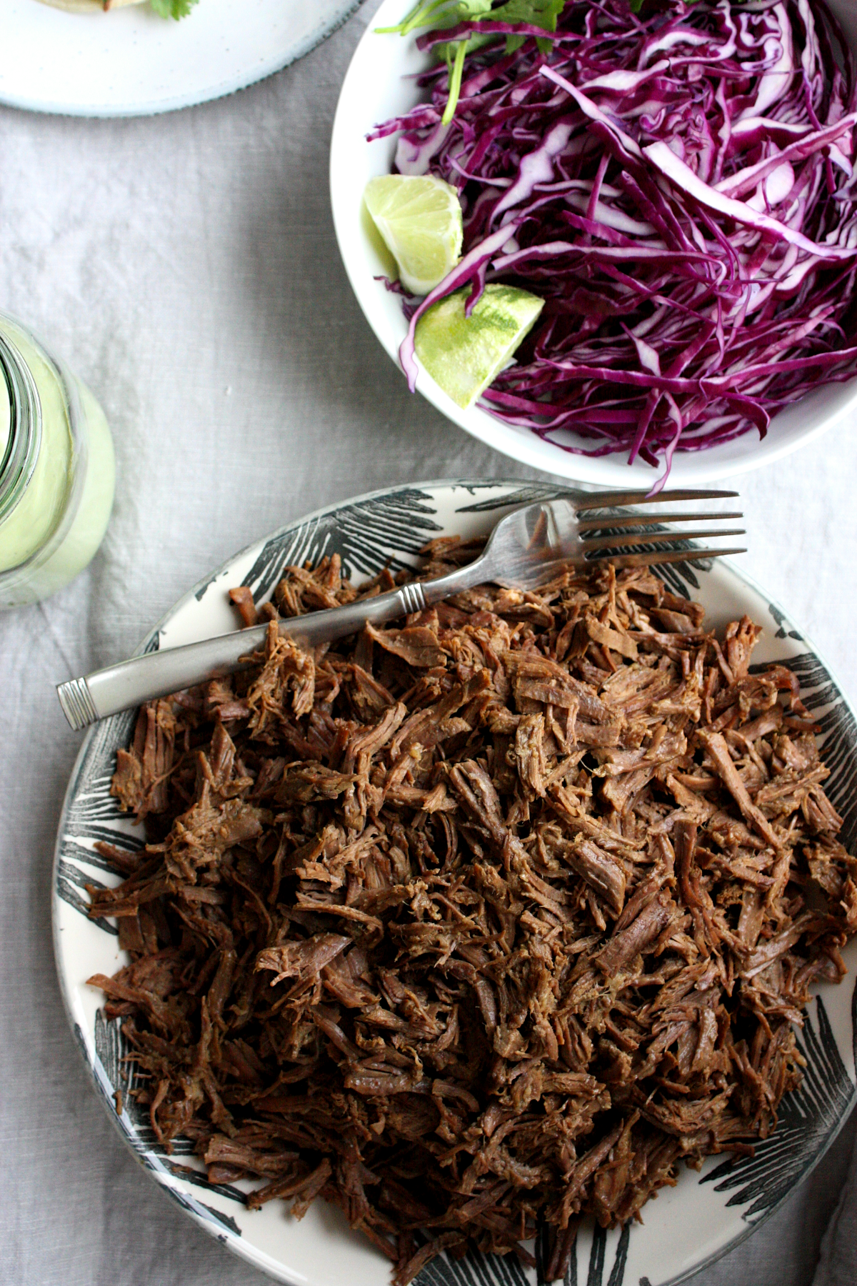 With the meat already so flavour-packed, fresh, simple fixings pair perfectly. Cabbage, cilantro, red onion, and crumbled feta. That’s it. Prepare them in advance and give yourself a high-five. Now, on to what brings it all together — THE most tasty dressing, lime crema. Avocado, limes, mayo, sour cream and salt and pepper. Throw all in a blender, and voila, pot roast taco dressing perfection.