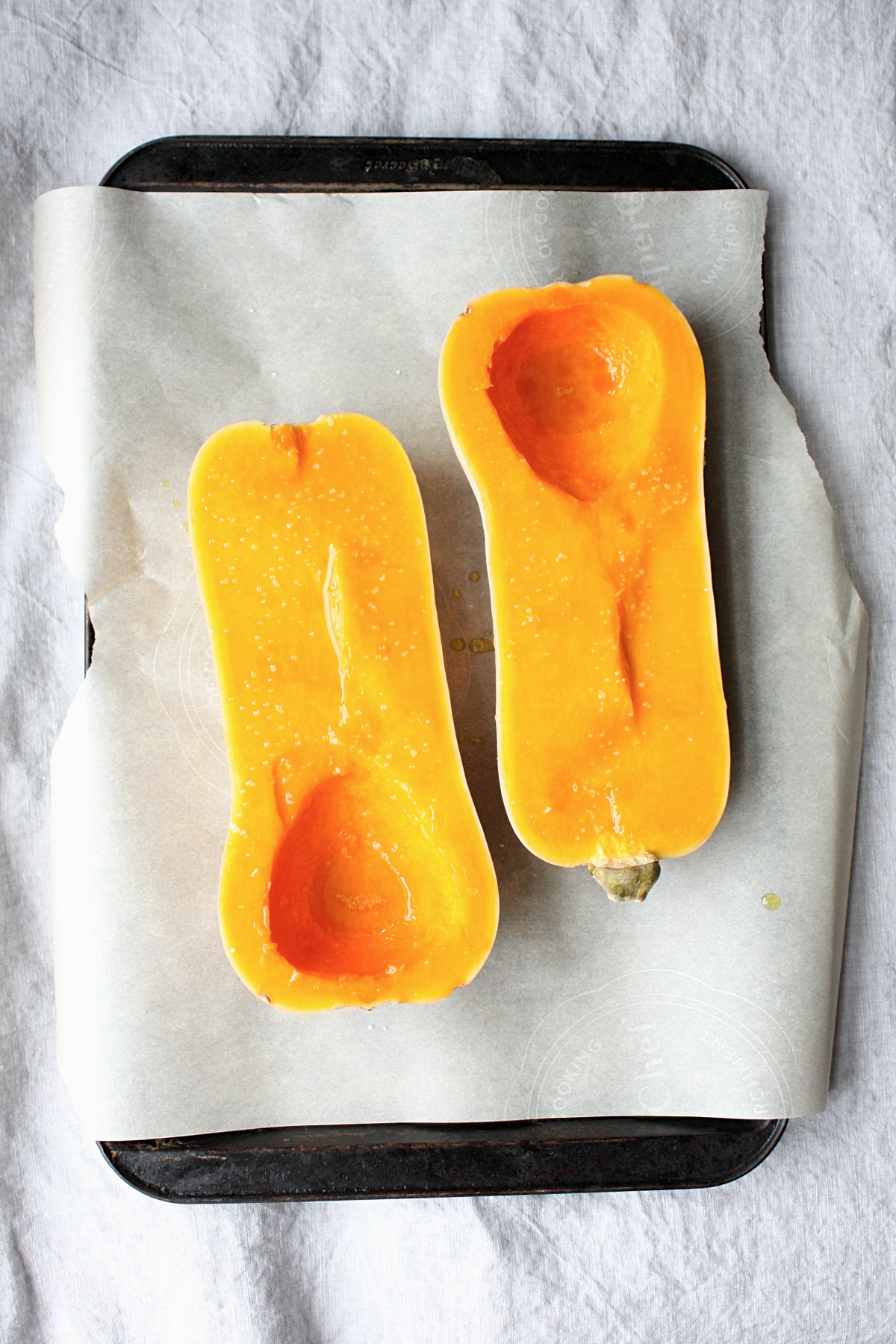 - Place half of a medium-sized butternut squash on a parchment paper lined baking sheet skin side down. Drizzle with olive oil and add a sprinkle of kosher salt. Roast in a 425 degree oven for 40-50 minutes until the flesh is very tender and easily scooped out of it's skin.