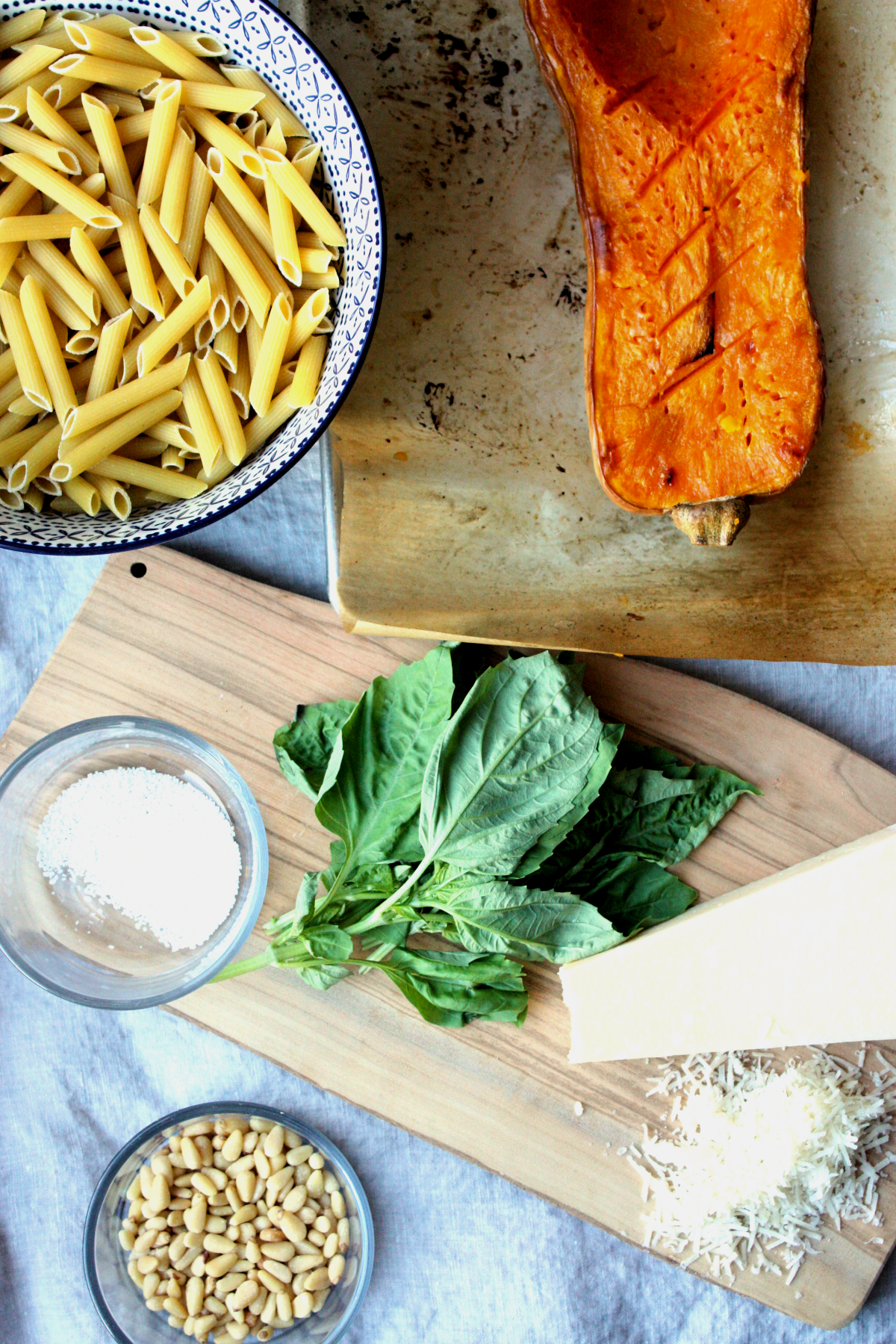 Now, a few things about this roasted butternut squash pasta. This is a weeknight friendly dish (if you allow for a little planning). The only time consuming element here is roasting up half a butternut squash, which took me 50 minutes in a 425 degree oven. For a quick weeknight meal, roast your squash the night before and have it ready to throw into the sauce, which for the record, is super simple and flavourful. Olive oil, scallions, cooking cream, parmesan, salt and pepper, a pinch of nutmeg (and the squash of course). That’s it. Whisked together, brought to a slow boil, and finally, blended smooth with a hand-held immersion blender (all while your pasta of choice simmers away nearby). Pour the sauce into the cooked pasta, add pine nuts, and chopped basil. Season with salt and pepper, and stir until well combined. Serve with additional parmesan for good measure. Hungry mouths will be happy.